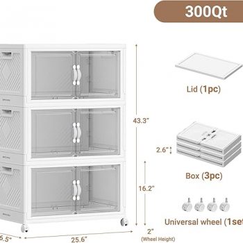 Amazon : $107.99 ($146.99) 300QT Extra Large Stackable Storage Bins, 75Gal Clear Plastic Closet Organizer Cabinet with Lid and Wheels, Collapsible Latch Boxes Folding Drawer with Door for Home Office, V20 3Pack White