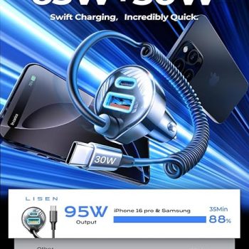 Amazon : $11.16 ($21.99)   LISEN 65W Car Charger USB C Fast Charging for iPhone 16 15 Pro Max,Super Fast Type C Car Charger Adapter Fit iPhone 16e 15 Pro Max Plus,iPad Pro,Samsung Galaxy S25 S24 Ultra,Pixel,Android,Black