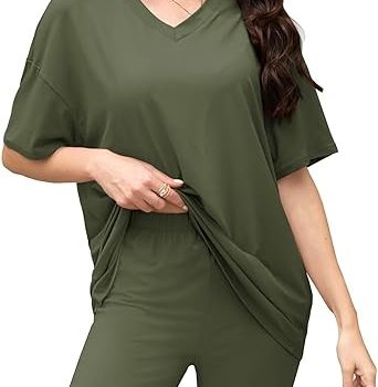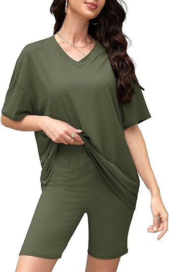 - Women’s 2 Piece Lounge Sets Summer V Neck Oversized Short Sleeve Tshirts Biker Shorts Matching Travel Outfits : at Amazon.com