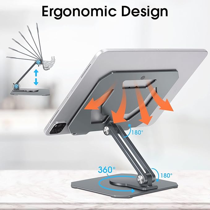 Amazon : $14.99 ($29.99)  Arae Tablet Stand Holder for Desk, 360°Rotating Adjustable Aluminum Portable Stand Holder Desktop Foldable Dock Heavy Duty Compatible with iPad 7/8/9/10th,iPad Air 6/5/4,iPad Pro 11/12.9,Gray