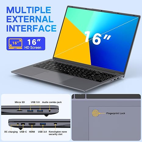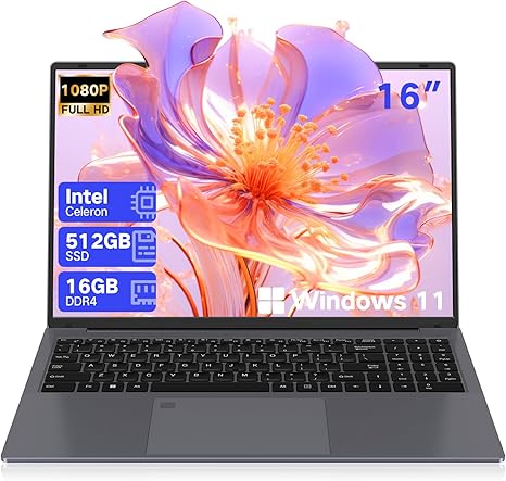 Amazon :$299.99 ($699.99)DERE 2024 Updated 16”Laptop Computer,16GB LPDDR4 512GB SSD, WIN11, Celeron N5805, 2560 * 1600 Notebook PC, Laptop with Fingerprint Unlock and Backlit Keyboard, HDMI,WiFi for Work,Study,Grey
