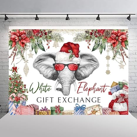 Amazon : $3.89 ($12.99)  Funny White Elephant Gift Exchange Party Decorations Christmas Photography Backdrop Banner 7x5ft for Adults, Winter Xmas Tree Background, Holiday Photo Booth Studio Supplies Props Ideas