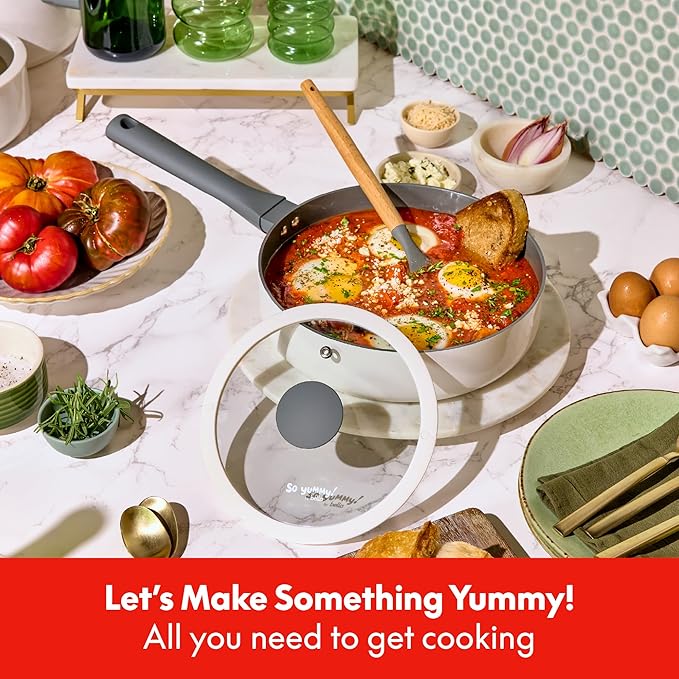 Amazon : $36.63 ($43.10)  So Yummy by bella 12 Piece Cookware Set w EverGood™ Ceramic Nonstick Coating​ and Silicone & Wood Utensils, Dishwasher Safe Silicone & Glass Lids, Oven Safe & All Stovetop Compatible, Frost, So Yummy