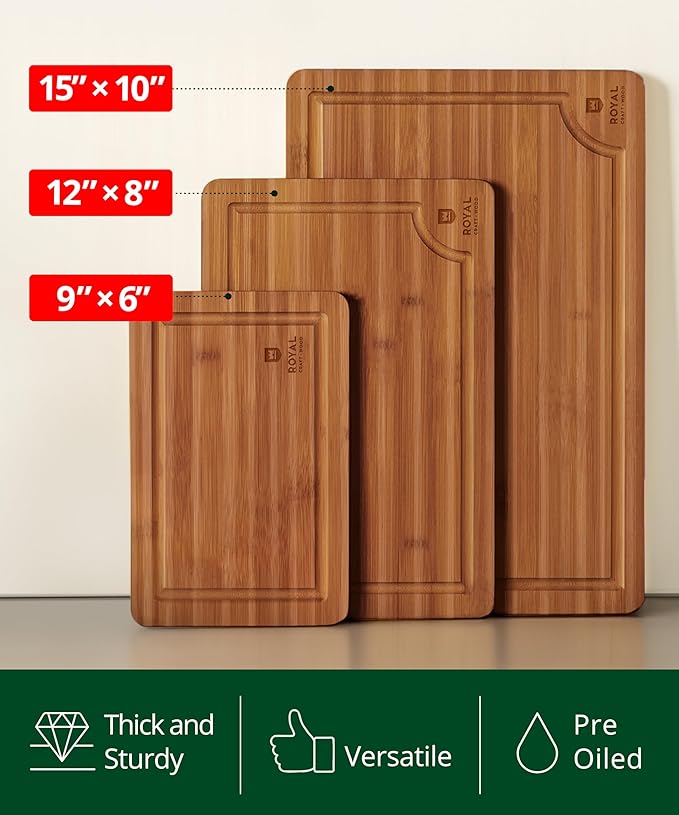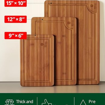 Amazon :$36.93 ($49.97)ROYAL CRAFT WOOD Wooden Cutting Boards for Kitchen Meal Prep & Serving – Bamboo Wood Serving Board Set with Deep Juice Groove Side Handles – Charcuterie & Chopping Butcher Block for Meat (3 Pcs)