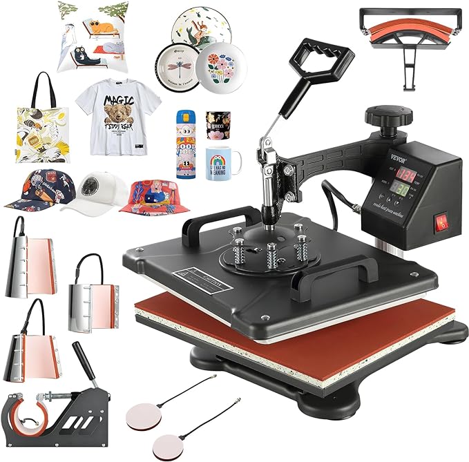 Amazon : $49.99 ($222.22)  VEVOR 8 in 1 Heat Press Machine Combo, 360° Swing Away Tshirt Press Machine for Printing Hat Mug T Shirts Cap, 12×15 Digital Multifunctional Sublimation Heat Transfer Machine