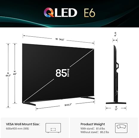 Amazon : $769.99 ($1299.99) Hisense 85” E6 Cinema Series QLED 4K UHD Smart Fire TV (85E6QF, 2025 Model) – QLED, AI Light Sensor, Dolby Vision · Atmos, Voice Remote with Alexa, Motion Rate 120, HDR 10+ Adaptive, Game Mode Plus