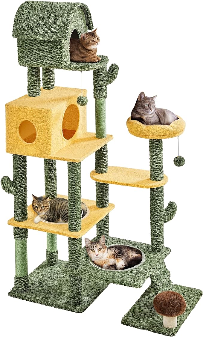 Amazon : $98.39 ($129.99)  Yaheetech Cactus Cat Tree, 68.5in H Oasis-Themed Cat Tower for Indoor Cats, Extra Large Cat Condo Play House with Flower-Shaped Perch, Scratching Posts, Acrylic Clear Bowl, Mushroom, Bell Ball