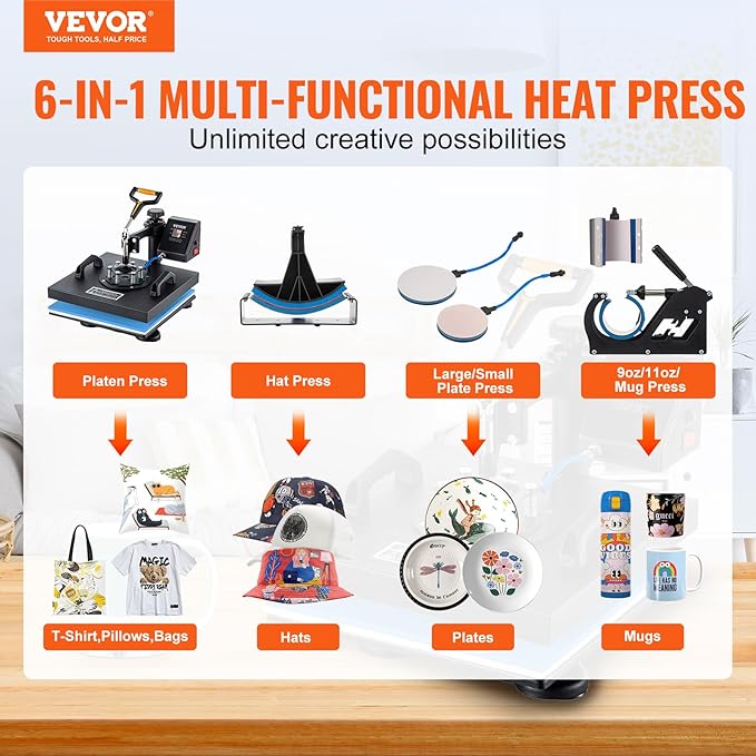 Amazon : $99.99 ($199.98)  VEVOR Heat Press Machine, 6 in 1 Combo Heat Press, 15” x 15” Heat Transfer Machine 360-Degree Swing Away Digital Shirt Printing, Multi-function Heat Transfer Sublimation for T Shirts Hat Mug Plate Cap