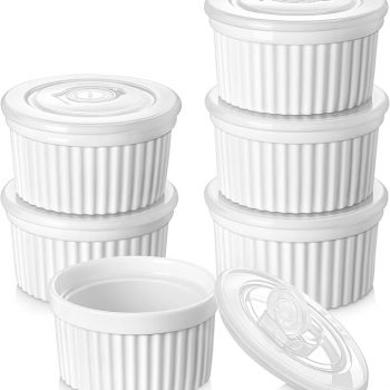 Amazon:$13.99 ($23.99)vancasso 8 oz Ramekins with Lid, Porcelain Creme Brulee Souffle Dishes, White Pudding Custard Cups Ramiken for Baking, Dishwasher and Oven Safe, Set of 6