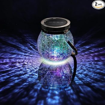Amazon:$17.99 ($35.99)Cooo 2 Pack Solar Lantern Outdoor Waterproof Iridescent Crackle Glass with 215% Larger Solar Panel, Stainless Steel Lid – Rainbow Glass Hanging Light with Cool White LED for Garden Patio Table