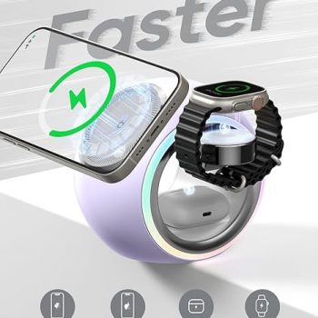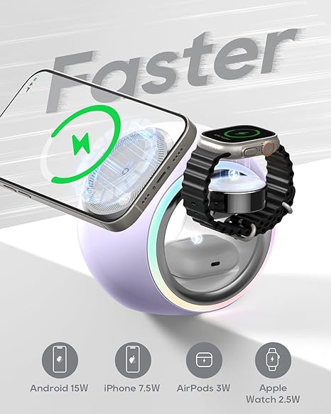 Amazon:$19.59 ($45.99)Kuulaa 3 in 1 Charging Station for Apple Devices, Mag-Safe Wireless Charger for iPhone Apple Watch and AirPods, Magnetic Charger for Android Samsung Smartwatch and Earphones (Purple)