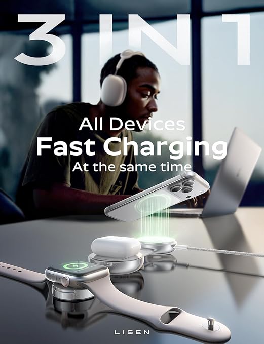 Amazon:$19.99 ($39.99)LISEN 15W Qi2 MagSafe Charger, Portable 3 in 1 Charging Station Apple Wireless Charger iPhone and Watch Charging Station, Magnetic Phone Charger iPhone Airpods Apple Watch Charger Fast Charging