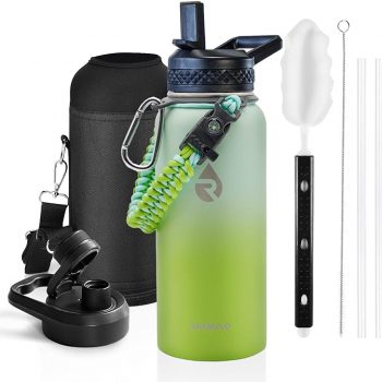 Amazon:$22.99 ($32.99)Insulated Water Bottle 32 oz, Triple Wall Vacuum Stainless Steel (Cold for 48 Hrs), Leak Proof & Non-BPA, Modern Water Flask Jug with Paracord Handle & Straw Spout Lids, Ombre Green