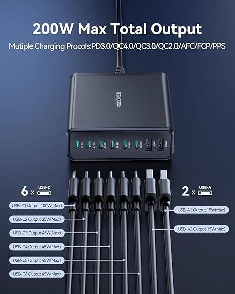 Amazon:$23.99 ($59.99)200W USB C Charging Station, Rocoren 8 Ports GaN PD3.0 & QC4.0+ 100W Laptop Charger, Multiport 45W PPS USB C Desktop Charger, Fast Wall Charger Block for MacBook Pro, iPhone 16, iPad, Samsung S25, HP