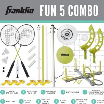 Amazon:$25.26 ($49.99)Franklin Sports Fun 5 Combo Outdoor Game Set – Backyard, Beach + Camping Games for Kids – Badminton, Volleyball, Flip Toss, Flying Disc – Horseshoes or Ring Toss