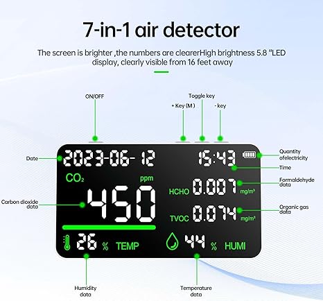 Amazon:$26.91 ($45.33)CIS 7-in-1 Air Quality Monitor, Indoor Humidity Monitor, Temperature, CO2, TVOC, HCHO, Time, Date Display Desktop Air Quality Tester, Air Quality Meters for Home Office Hotel Restaurant School