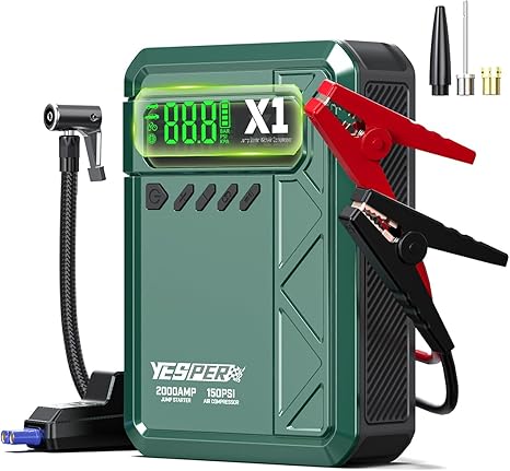 Amazon:$27.99 ($69.99)YESPER Car Jump Starter with Air Compressor, 2000A Peak Portable Jump Pack with 150PSI Digital Tire Inflator, 12V 12000mAh Battery Charger Jumper Starter for Up to 8L Gas & 6L Diesel Engines