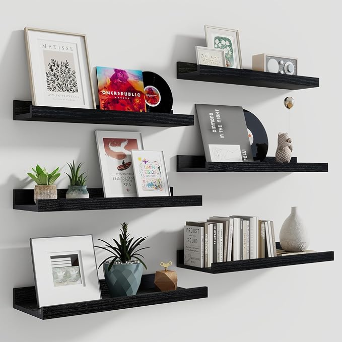 Amazon:$28.79 ($35.99)Fun Memories Picture Ledge Shelf, 16 Inch Long Floating Shelves Set of 6, Picture Shelf for Wall with Lip, Large Nursery Book Shelves for Storage, Wall Shelves for Living Room Bedroom Kitchen, Black