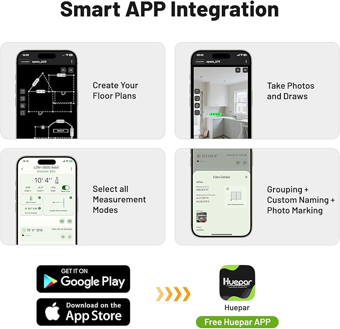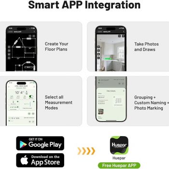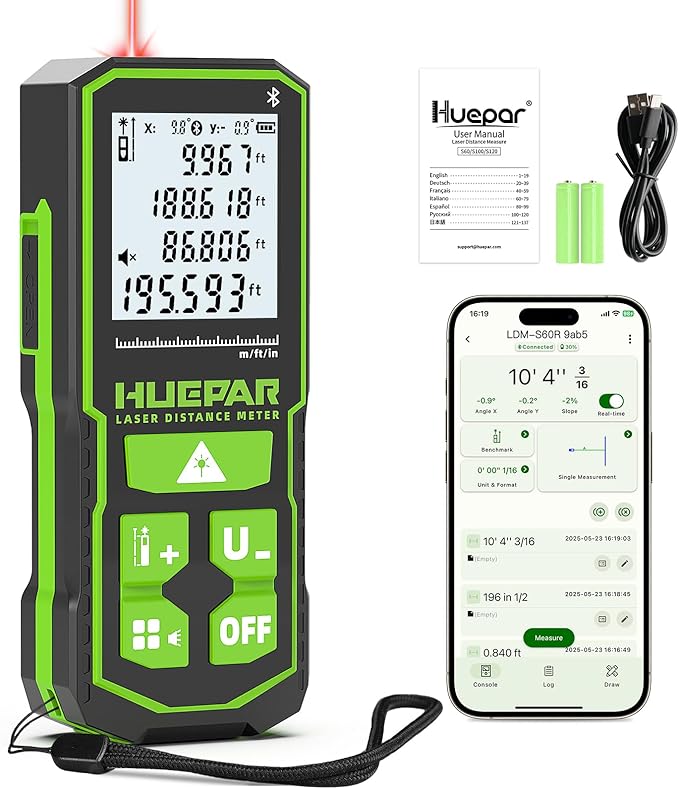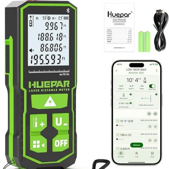 Amazon:$29.99 ($49.99)Huepar Laser Distance Measure 200Ft. Digital Rechargeable Laser Measuring Tool with Bluetooth -Phone APP, 1/16in Accuracy, Angle Sensor, M/in/Ft Unit, Pythagorean Mode, Measure Distance, Area, Volume