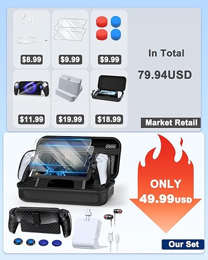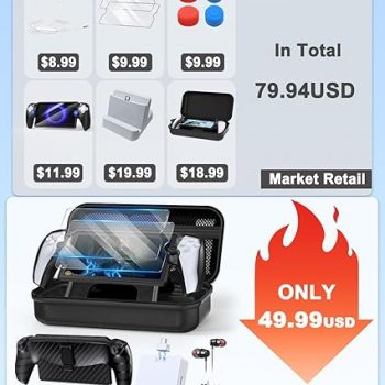 Amazon:$34.99 ($49.99)13 in 1 Accessories Set for Playstation Portal Remote Play, Carrying Case for PS Portal,TPU Cover with Kickstand,Portable Charging Dock,2 Screen Protector,4 Thumb Grip,Earbud Headphones for PS Portal (Black)