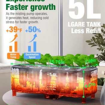 Amazon:$44.79 ($109.99)Misting Hydroponic Growing System 15 Pods Herb Garden Kit Indoor, 5L Large Tank Plant Germination Kit with Adjustable Height Grow Light to ”20”, Quiet Pump, Auto Timer, Gardening Christmas Gifts