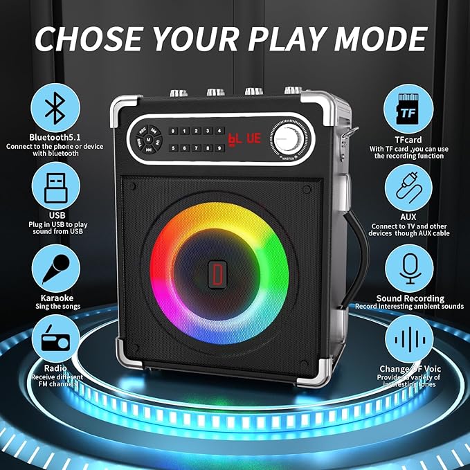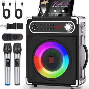 Amazon:$53.99 ($89.99) Karaoke Machine, Portable Bluetooth Speaker with 2 Wireless Microphones, Karaoke Microphone with Bass/Treble Adjustment, PA System with Remote Control, Lights, Support USB/TF/REC/FM/AUX/TWS for Party