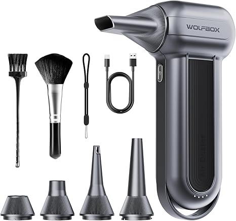 Amazon:$62.99 ($139.99)WOLFBOX MF100 Electric Air Duster-150000RPM Super Power Cordless Air Duster, Rechargeable Brushless Motor Durable Blower, 3-Gear Adjustable Dust Blower for Computer, Keyboard, Outdoor, House and Car