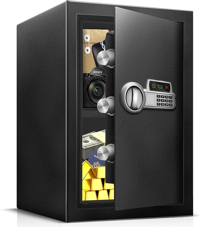 Amazon:$79.99 ($159.99)Safe Box 1.5 Cu Ft, Steel Security with Digital Electronic Keypad, Safety Lock Box, Sensor Light, Removable Shelf, Home Safe for Valuables Documents Money Jewelry Guns