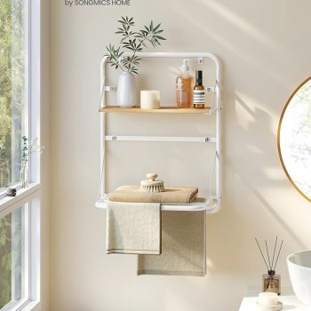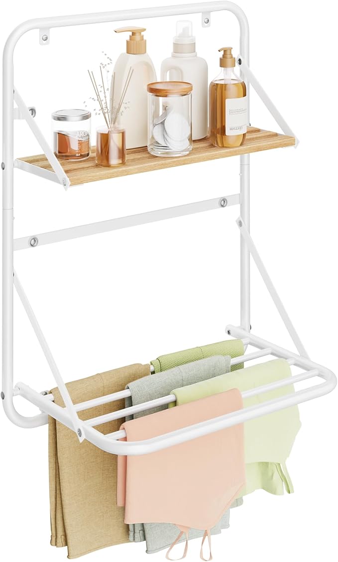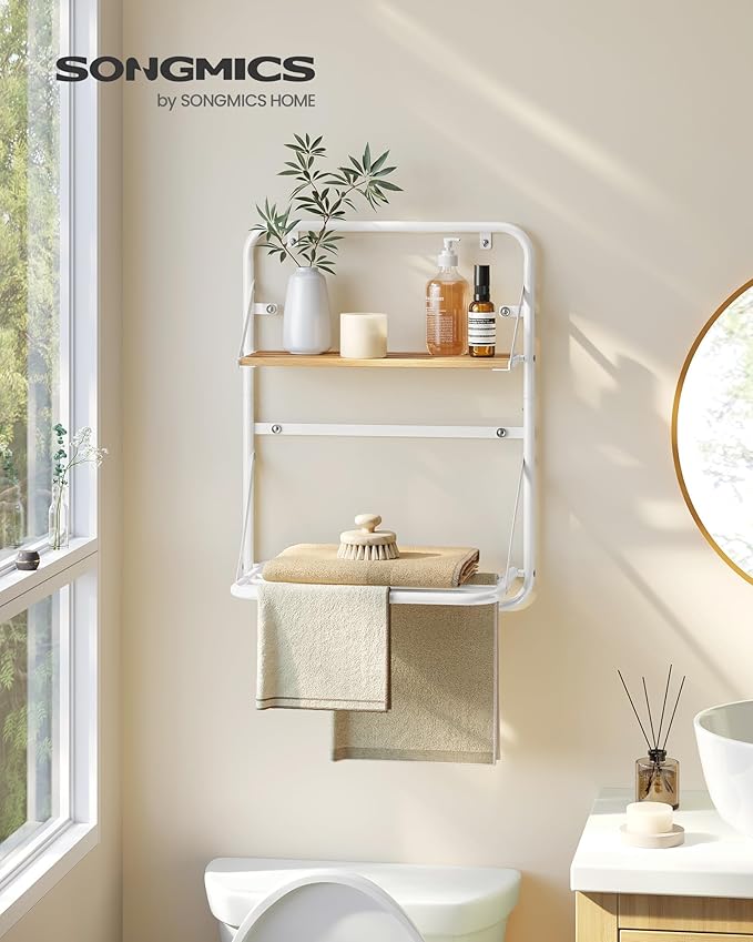 Amazon:$9.99 ($29.99)SONGMICS Clothes Drying Rack, Wall-Mounted Drying Rack Clothing, Foldable Drying Rack, with Storage Shelf, Hanging Rods, Magnetic Design, for Laundry Room, Bathroom, Cloud White ULLR803W01