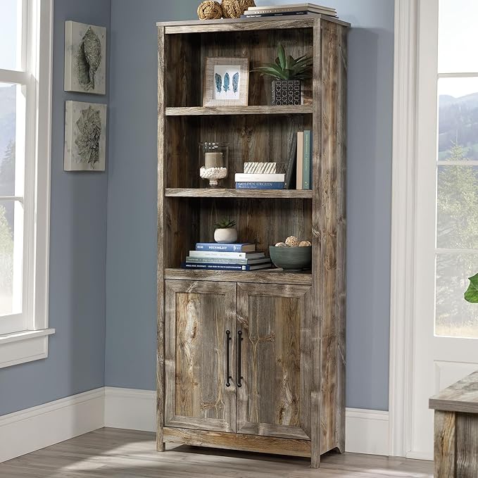 Amazon:$99.59 ($225.00)Sauder Granite Trace Book Shelf, Bookshelf with Storage, Library Bookcase with Doors and Adjustable Shelves, in Rustic Cedar Finish
