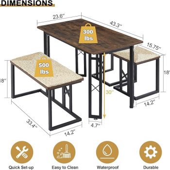 Amazon:$99.99($107.99)VECELO 43.3″ Dining Table Sets, Farmhouse Kitchen Table for 4 with 3 Seats & Wicker Seat Cushions,Metal Frame Space-Saving Adjustable Feets Coffee Table for Home Kitchen Dining, Dark Brown